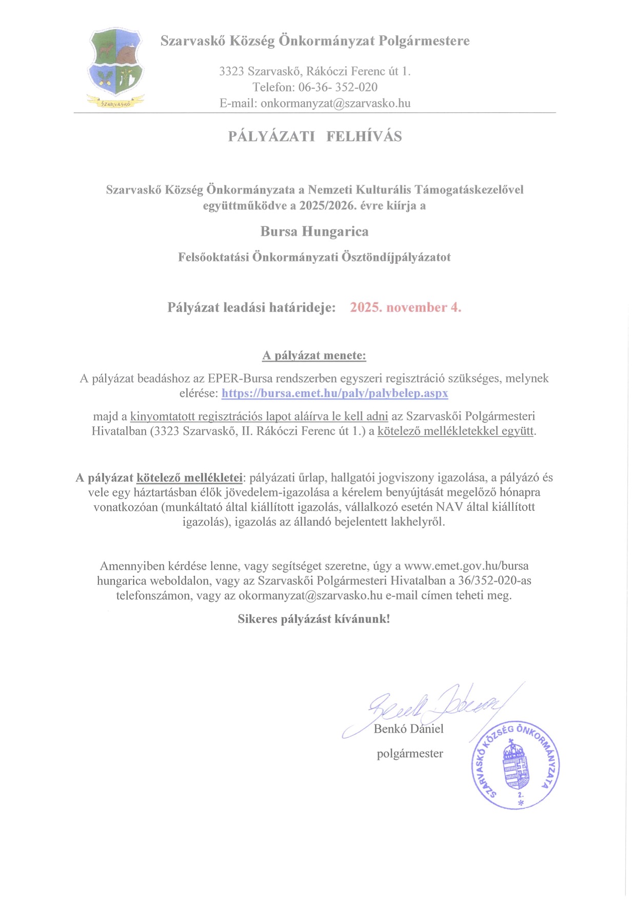 A kérelmeket Szarvaskő Község Önkormányzatánál (3323 Szarvaskő, Rákóczi Ferenc u. 1.) kell leadni.